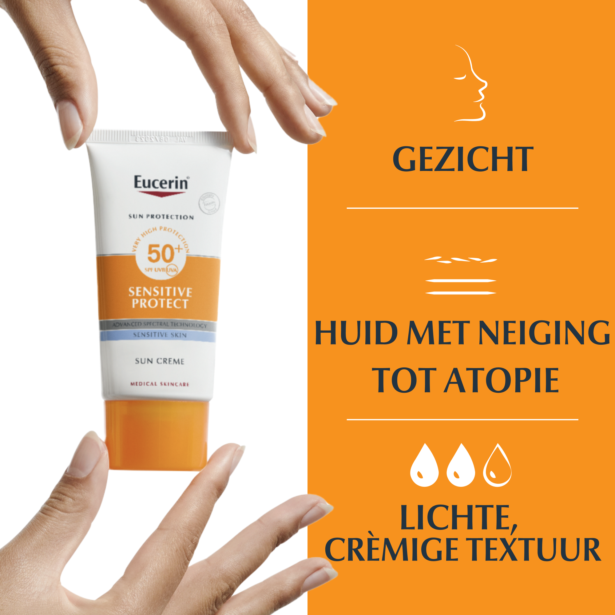 Eucerin Sun Sensitive Protect Crème SPF50+ 50ml beschermt en kalmeert de gevoelige en droge huid tegen beschadiging door de zon. Klinische en dermatologische studies bewijzen: Hoge huidverdraagzaamheid bij de gevoelige huid en een huid met neiging tot atopie. Innovatie: *Met een ADVANCED SPECTRAL TECHNOLOGY combineert UVA/UVB filters, voor zeer hoge UV-bescherming en anti-oxidant Licochalcone A, dat inwerkt op vrije radicalen gegenereerd door UV en hoog energetisch zichtbaar licht. De formule met Glycyrrhetinezuur versterkt het natuurlijk herstellend mechanisme van de huid.