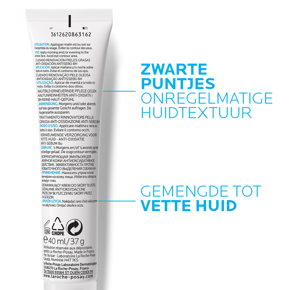 La Roche-Posay Effaclar K+ Dagcrème 40ml is een specifieke dagcrème voor de vette tot gecombineerde huid, Effaclar K+, heeft een ultrafrisse en niet-vette aquagel-textuur. De crème wordt snel geabsorbeerd, waarbij het Tot 8 uur hydrateert en comfort biedt aan een onrustige huid. Niet-comedogeen, dus deze huidverzorging verstopt een huid met mee-eters niet. Vochtinbrengende huidverzorging die dag na dag overmatige talg vermindert, mee-etertjes helpt te verminderen en een grove huidtextuur tegengaat. Vochtinbrengende huidverzorging die dag na dag overmatige talg vermindert, mee-etertjes helpt te verminderen en een grove huidtextuur tegengaat. Werkzaamheid vermindering mee-eters en grove huidtextuur Effaclar K+, volgens onderzoek Effaclar K+ is uitvoerig getest. Volgens testpersonen die kampen met een vette, grove huidtextuur met veel mee-eters is dit een effectieve huidverzorging: • Biedt 8 uur lang hydratatie en een matterend effect. • Na 1 maand zien consumenten verschil; de huidtextuur ziet er fijner uit, en de poriën zijn minder zichtbaar. * • Na 8 weken gebruik, waarna er niet meer wordt gesmeerd met de dagcrème, houdt de vermindering van puistjes en mee-eters nog tot 3 weken aan. ** * Zelfevaluatie, 50 personen na 4 weken tweemaaldaags gebruik. ** Klinische studie, gemeten bij 38 personen na 11 weken (waarvan 8 weken tweemaaldaags gebruik)