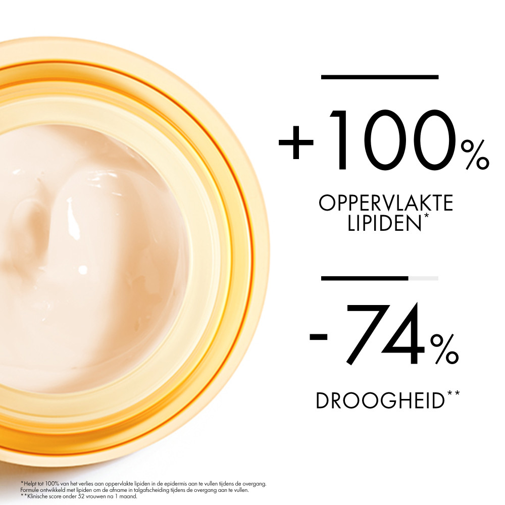 Vichy Neovadiol Lipidenaanvullende Revitaliserende Nachtcrème 50ml zorgt voor een intense voeding en versterking van droge huid als gevolg na de overgang. Een echte innovatie voor vrouwen tijdens en na de overgang, die door hormonale veranderingen vaak een veel drogere huid hebben. De nachtcrème is verrijkt met Omega's 3-6-9 en voedt de huid, terwijl proxylane helpt om haar meer volume te geven. Hypoallergeen en getest onder dermatologisch toezicht. Het is het nummer 1 merk dat in Europa wordt aanbevolen voor vrouwen na de overgang. Bij het wakker worden, ziet de huid er gladder, steviger en voller uit. Geschikt voor alle huidtypes, ook voor de gevoelige huid en voor jongere vrouwen die nog niet na de overgang zitten maar een droge huid hebben. +100% oppervlakte lipiden in de epidermis* -74% droogheid** +44% soepelheid** *Helpt tot 100% van het verlies aan oppervlakte lipiden in de epidermis aan te vullen tijdens de overgang. Formule ontwikkeld met lipiden om de afname in talgafscheiding tijdens de overgang aan te vullen. **Klinische score onder 52 vrouwen na 1 maand.